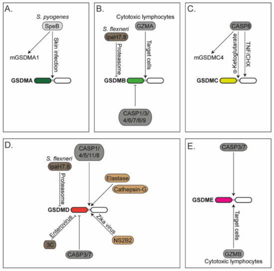Regulation of gasdermins: (A) Human gasdermin-A (GSDMA) and murine GSDMA1 are cleaved by the cysteine protease SpeB from Streptococcus pyogenes (S. pyogenes) during skin infection. (B) Gasdermin-B (GSDMB) is cleaved by granzyme-A (GZMA) delivered by cytotoxic lymphocytes. GSDMB is cleaved and inactivated by recombinant caspases-1/3/4/6/7/8/9 (CASP1/3/4/6/7/8/9). IpaH7.8 effector protein from Shigella flexneri (S. flexneri) ubiquitinates GSDMB that triggers its degradation via the proteasomal pathway. (C) Human gasdermin-C (GSDMC) and murine GSDMC4 are cleaved by caspase-8 (CASP8) in cells treated with tumour necrosis factor (TNF) and cycloheximide (CHX) or cells stimulated with α-ketoglutarate. GSDMC is cleaved at two different sites by CASP8. (D) Gasdermin-D (GSDMD) is cleaved by caspases-1/4/5/11/8 (CASP1/4/5/11/8), neutrophil protease elastase, cathepsin-G and NS2B2 from Zika virus. GSDMD is cleaved and inactivated by caspases-3/7 (CASP3/7) and the viral protease 3C from enteroviruses. The IpaH7.8 effector protein from S. flexneri ubiquitinates GSDMD that triggers its degradation via the proteasomal pathway. (E) Gasdermin-E is cleaved by CASP3/7 and granzyme-B (GZMB) derived by cytotoxic lymphocytes.