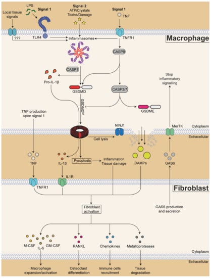 A new conceptual framework allows us, in this review, to discuss, or rather hypothesize, how the cellular cross-talk between fibroblasts and macrophages may promote disease progression in RA and inflammation. We specifically focus on how this cross-talk is shaped by the signals that induce cell death (e.g., TNF), signals that sense cell death and damage (e.g., TAM receptors, inflammasomes), or signals that are produced as a result of cell death pathway activity (e.g., IL-1).