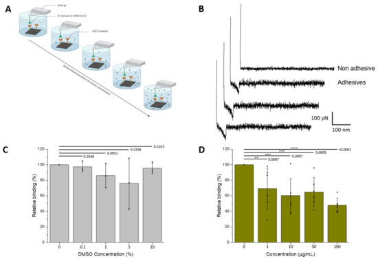 In a second step, the influence of the plant extract was evaluated on the binding of UV-inactivated SARS-CoV-2 virions grafted onto the AFM tips (Figure 2A,B). Working directly on full virions enables to accommodate more physiological conditions, in particular the multivalency encountered during virus binding to cell surface receptors.
