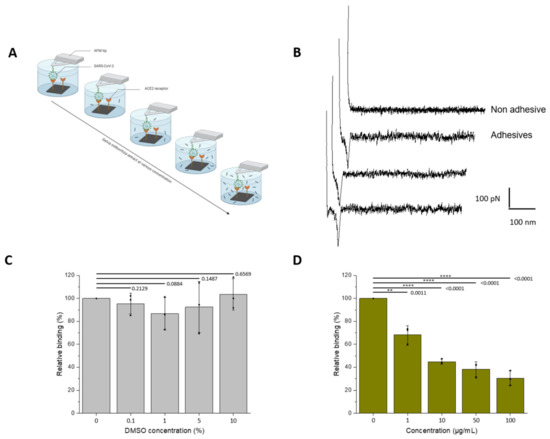 Assessment of the inhibitory effect of a S. miltiorrizha extract powder on the interaction between the UV-inactivated SARS-CoV-2 virions and ACE2 monitored by AFM. (A) The inhibitory potential of roots S. miltiorrhiza extract is assessed by measuring the binding probability between the UV-inactivated SARS-CoV-2 immobilized on the AFM tip and the ACE2 receptor grafted on a model surface, before and after incubation with the extracts at increasing concentrations (0, 1, 10, 50, and 100 µM, respectively). (B) Examples of non-adhesive (above) and adhesive (below) force distance curves recorded between UV-inactivated SARS-CoV-2 virions-functionalized AFM tips and ACE2-coated model surfaces showing specific adhesion events. (C,D) Histograms showing the binding probability (BP, expressed in %) with the different concentrations of extracts (0, 1, 10, 50, and 100 µM) or DMSO for the control (0, 0.01, 0.1, 0.5, and 1%). The error bar indicates s.d. of the mean value. One data point belongs to the BP from one map. The figure on panel a was created with Biorender.com (accessed on 10 March 2022).