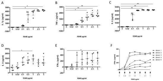Dose-response release of interleukin (IL)-1β (A), TNF-α (B), IL-6 (C), IL-8 (D), and IFN-α (E–F) following PMBC activation by R848 (0.02, 0.1, 0.5, 1, 2.5, and 5 µg/mL; 0, DMSO control) on PMBC release of interleukin (IL)-1β (A), TNF-α (B), IL-6 (C), IL-8 (D), and IFN-α (E,F). Data are median ± interquartile range (n = 5 separate experiments; * p < 0.05, ** p < 0.01).
