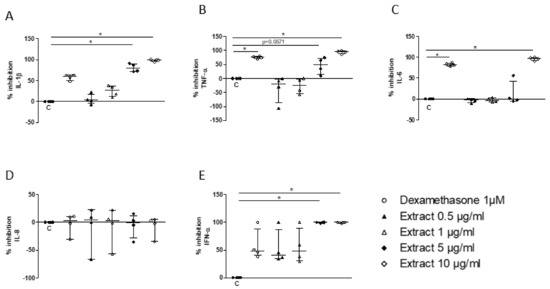 In a second step, this in vitro system was used to assess whether S. miltiorrizha extract could regulate the response of PBMC to TLR7/8 activation. Following preincubation for 1 h of PBMC with the extract, a significant inhibition of IL-1β, TNF, and IL-6 was observed at a concentration of 5 or 10 µg/mL (Figure 4A–C), with a similar potency when compared to 1 μM dexamethasone, the current reference treatment for COVID-19. Hence, no significant effect was observed on IL-8/CXCL8 secretion (Figure 4D), whereas the release of IFN-α was completely suppressed at 5 μg/mL, achieving a stronger inhibition than 1 µM dexamethasone (Figure 4E).