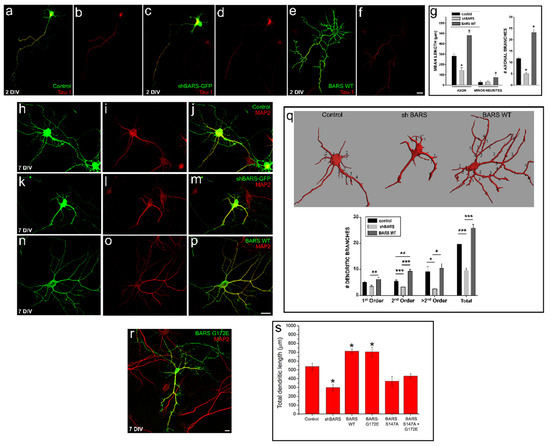 As reported previously [16,18], after 2 DIV most control neurons (either non-transfected or expressing control sc-shRNA-BARS-GFP) have acquired morphological polarity displaying a single long (more than 250 µm in length) Tau-1 (+) axon (Figure 2a,b,g) and several much shorter Tau-1 (−) minor neurites. Neurons expressing the shRNA-BARS-GFP displayed a similar morphology, but with axons significantly shorter than those of control cells with less collateral branches (Figure 2c,d,g). By contrast, ectopic expression of BARS WT significantly increased axonal and minor neurite lengths, with both types of processes exhibiting numerous collateral branches (Figure 2e–g). BARS up- or down-regulation also influenced dendritic morphology. BARS suppression significantly reduced dendritic length and branching while overexpression had the opposite effect (Figure 2h–q,s). To gain further insight into this phenomenon, we tested whether it might reflect BARS functioning at the Golgi apparatus by examining the consequences of overexpressing BARS mutants (Supplementary Figure S2 and Methods) with reduced nuclear localization or lacking fission activity on dendritic morphology. We first tested BARS G172E, a mutant variant exhibiting loss of repressor activity caused by failure to dimerize and localize to the cell nucleus [9]; ectopic expression of this mutant increased dendritic length and branching, as in the case of the WT variant (Figure 2r,s). Then, we evaluated the effect of two BARS mutants with reduced fission activity and both of them, BARS S147A [4] (Figure 2s) and BARS D355A [3] (not shown), significantly decreased dendritic length. The stimulatory effect of BARS was also absent after expression of the double mutant S147A G172E (Figure 2s). Together, our observations indicate that BARS promotes axon/dendrite growth and branching and suggest that this effect involves Golgi membrane fission.