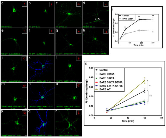 TfR-GFP-FM4 displayed a diffuse distribution throughout the cell body, and dendrites (Figure 4a) in cultured neurons fixed before and immediately after the addition of cycloheximide or DD; this pattern was similar to that of ER markers, such as calnexin (not shown). However, 15 min after treatment with DD, TfR-GFP-FM4 redistributed to the cell body completely colocalizing with GA markers, such as TGN38 (Figure 4b); by 60 min punctate labeling was also detected in dendritic-like processes (Figure 4c). Four hours later (300 min after DD), TfR-GFP-FM4 almost disappeared from the TGN, with strong labeling of dendritic processes (Figure 4d); GFP fluorescence was also detected in close proximity to the plasma membrane (Figure 4d, arrowheads). TfR-GFP-FM4 distribution was also evaluated in neurons co-expressing BARS D355A (Figure 4e–h). The results obtained showed that ectopic expression of this fission-defective mutant did not prevent accumulation of TfR-GFP-FM4 at the GA 15 min after DD (Figure 4f), but considerably decreased its presence in dendrites at later time points; thus, at 60 and 300 min post-solubilizer, most of the TfR-GFP-FM4 signal remained at the GA (Figure 4g,h). Quantitative evaluation of TfR-GFP-FM4 fluorescence ratio between dendrites and the GA in control conditions and in cells expressing the fission-deficient BARS mutant D355A confirmed our qualitative observations (Figure 4i). As already at 60 min after DD solubilizer was shown a markedly and statistically significant difference between control and BARS D355A fission mutant; we used this time point to evaluate forthcoming treatments (Figure 4i). A similar phenomenon was observed when co-expressing TfR-GFP-FM4 with BARS S147A (Figure 4j–l,s) or with BARS double mutant S147A G172E (Figure 4m–o,s). By contrast, ectopic expression of BARS WT accelerated and significantly increased the GA exit and trafficking of TfR into dendrites. (Figure 4p–s). Taken together, the experiments described in this section clearly demonstrate that BARS regulates the TfR exit from the GA, most likely via the TGN.
