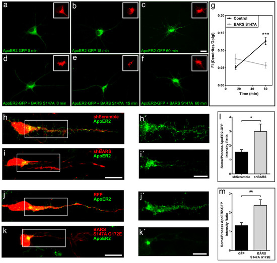 BARS regulates trafficking of ApoER2. (a–f) A series of confocal images showing the distribution of ectopically-expressed FM4-ApoER2-GFP alone or after co-transfection with BARS S174A and visualized 0, 15 and 60 min after the addition of DD solubilizer. Inset, distribution of the Golgi apparatus marker TGN38. Scale bar: 10 µm. (g) Graph showing the fluorescent intensity (FI) ratio between ApoER2-GFP labeling in dendrites and the Golgi area 15 and 60 min after the addition of DD solubilizer in control- and BARS S147A-expressing neurons. For all experiments, 9 neurons were quantified pooled from at least three independent cultures. Graphs represent mean ± S.E.M.; *** p < 0.001, Student’s t-test. (h) A confocal image showing the distribution of ApoER2 in a cortical neuron of mouse brain (embryonic day E18.5) transfected by IUE with sc-shRNA BARS-HcRED (scScramble,) plus ApoER2-GFP; note that the green labeling localized to a discrete area in the cell body and within the apical oriented neurite (image rotated 90º clockwise with respect to the ventral zone–cortical plate axis). (i) Idem as in (h), but from a mouse brain (embryonic day E18.5) electroporated with sh-RNA-BARS-HcRED (shBARS). (h’,i’) High magnification views of the inserts shown in (h,i). Scale bar: 5 µm. (j) A confocal image showing the distribution of ApoER2-GFP in a cell from a brain co-electroporated with RFP. (k) Idem as in (j), but from a brain electroporated with ApoER2 plus BARS S147A G172E. Scale bar: 10 µm. (j’,k’) High magnification views of the inserts shown in (j,k). Scale bar: 5 µm. (l) Graph showing the fluorescent intensity (FI) ratio between ApoER2-GFP labeling in the soma and the apical oriented neurite in cortical neurons after IUE of shScramble or shBARS. (m) Graph showing the fluorescent intensity (FI) ratio between ApoER2-GFP labeling in the soma and the apical oriented neurite in cortical neurons after IUE of RFP or RFP plus BARS S147A G172E. For all experiments 13 to 20 neurons were analyzed from 3 independent IUE for each experimental condition. Graphs represent mean ± S.E.M.; * p < 0.05, ** p < 0.01, Student’s t-test.