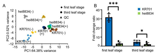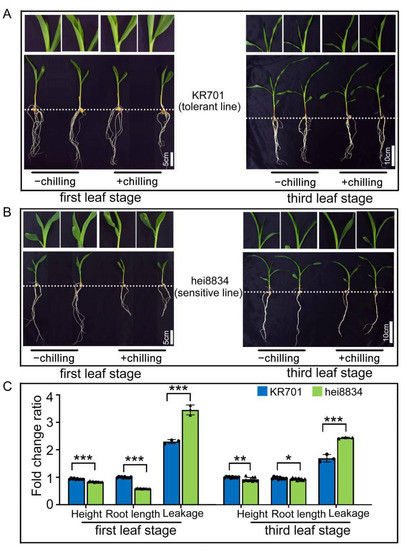 Physiological responses induced by chilling stress at different seedling stages. (A,B) Phenotypic changes in the inbred lines KR701 and hei8834 from the first leaf stage to the third leaf stage under normal condition and chilling stress condition. −chilling: uniformly growing seedlings were grown at normal condition for 24 h. +chilling: uniformly growing seedlings were grown at 4 °C for 24 h. (C) Fold change ratio of representative physiological traits (height, root length and relative leakage). Fold change ratio: +chilling/−chilling. Scale bar: 5 cm at the first leaf stage and 10 cm at the third leaf stage. The plant height and root length data are expressed as the means ± SD of 10 replicates. The “triangle”and “round” represented different repetitions. The relative leakage data are expressed as the means ± SD of three replicates. *, ** and *** denote levels of significance at p < 0.05, p < 0.01 and p < 0.001, respectively.