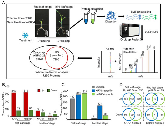 Quantitative proteomics analysis of chilling stress in maize seedlings. (A) Simple workflow for proteomics analysis. Experimental material backgrounds: tolerant- line KR701 and sensitive-line hei8834. Different stress treatments: −chilling: maize seedlings were grown at normal condition for 24 h. +chilling: maize seedlings were grown at 4 °C for 24 h. Diverse seedling stage: first leaf stage and third leaf stage. Scale bar: 10 cm. (B) Overall expression analysis of CRPs. (C) Stage-specific expression analysis of CRPs. (D) Specific classification analysis of CRPs.