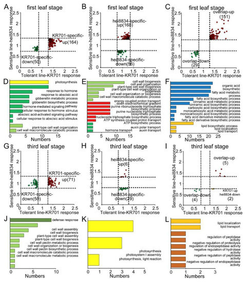 Distribution and GO functional enrichment analysis of CRPs. (A,D) Tolerant-line KR701-specific CRPs at the first leaf stage. (B,E) Sensitive-line hei8834-specific CRPs at the first leaf stage. (C,F) Overlapping CRPs of the tolerant-line KR701 and sensitive-line hei8834 at the first leaf stage. (G,J) Tolerant-line KR701-specific CRPs at the third leaf stage. (H,K) Sensitive-line hei8834-specific CRPs at the third leaf stage. (I,L) Overlapping CRPs of the tolerant-line KR701 and sensitive-line hei8834 at the third leaf stage.