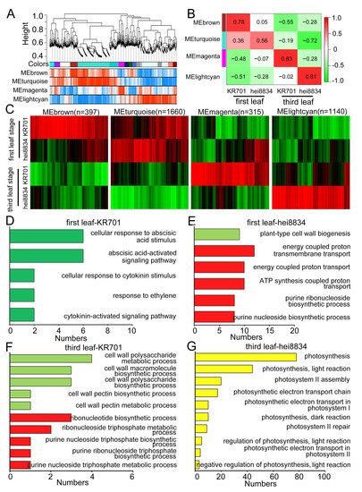 Network analysis of chilling stress in maize seedlings. (A) Coexpression modules identified using WGCNA. (B) Division of representative modules. At the first leaf stage, the change patterns of the tolerant-line KR701 were represented by the “MEbrown” module, and those of the sensitive-line hei8834 were represented by the “MEturquoise” module. At the third leaf stage, the change patterns of the tolerant-line KR701 were represented by the “MEmagenta” module, and those of the sensitive-line hei8834 were represented by the “MElightcyan” module. (C) Heatmap of the relative expression of 6631 genes in four representative stage-specific modules across all samples. (D–G) GO functional enrichment analysis of representative modules.