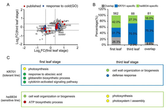 Most previous physiological studies on chilling stress resistance have focused on the third leaf stage of maize, and only a few have mentioned the first leaf stage [8,39]. Based on the proteome patterns of KR701 and hei8834, we suggest that the first leaf stage is also critical for maize resistance to chilling stress. Our proteomics results further revealed that most published chilling-related proteins were primarily responsive to chilling stress at the first leaf stage but not at the third leaf stage. The physiological properties and protein functions of maize confronting chilling stress specifically at the first leaf stage warrant further investigation.