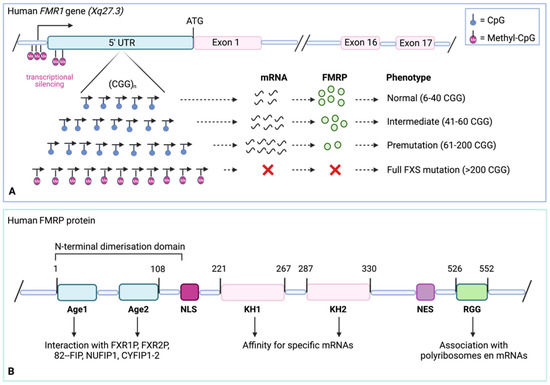 FMR1 gene structure and FMRP protein domains. (A) The human FMR1 gene located on chromosome Xq27.3. FMR1 is defined by seventeen exons with different methylation states of CpG islet located in the 5′UTR, resulting in distinct Fragile X-related phenotypes. The 5′UTR is the common site of an expansion mutation in the FXS. (B) Human FMRP contains several conserved protein domains such as K homology domains (KH1, and 2 together with an RGG box which enable mRNA binding capacity. The Agenet (Age) domains act on histones and trimethylated lysine residues and facilitate FMRP protein–protein interactions.