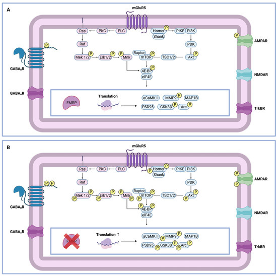 Schematic overview of the molecular signaling pathways in the FXS. (A) In physiological conditions, the glutamatergic pathway is activated upon binding of glutamate to the mGluR5 which is located on the postsynaptic cell membrane. A network of protein kinases and phosphatases, with their downstream signaling targets, either becomes activated or inhibited due to phosphorylation, thus regulating the activity of FMRP. Phosphorylation of FMRP results in the release of the bound mRNAs, causing protein translation. (B) Loss of FMRP causes a broad-range kinomic deregulation which results in a stronger phosphorylation of several protein kinase substrates, e.g., the GABAergic pathway is affected by loss of FMRP, because it stabilizes mRNAs of several subunits of the GABAA receptor. Loss of FMRP also causes translational imbalance with an increased synthesis of proteins such as Calcium/Calmodulin Dependent Protein Kinase II Alpha (αCaMKII), Matrix Metallopeptidase 9 (MMP9), Microtubule Associated Protein 1B (MAP1B), postsynaptic density protein 95 (PSD95), Glycogen Synthase Kinase 3 Beta (GSKβ), and Activity Regulated Cytoskeleton Associated Protein (Arc).