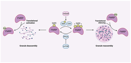 FMRP is a multifunctional protein that plays a role in translational repression through ribosomal stalling, where it is locally modulated by posttranslational modifications such as phosphorylation and methylation (Figure 3). Initially, mass spectrometry analyses of murine brains and cultured cells showed that FMRP is mainly phosphorylated between the amino acid residues 483 and 521. Within this sequence, primary phosphorylation takes place at the conserved serine 499, which subsequently triggers phosphorylation of the nearby residues Ser489, Ser493, Ser496, Ser503, Ser510, and Ser513 [49,50]. Strict regulation of FMRP phosphorylation is crucial for controlling its ability to modulate the translation process. It is well established that signaling through neuronal GPCRs, including the metabotropic glutamate receptor (mGluR), impacts the phosphorylation status of neuronal proteins. Therefore, the translational activity of FMRP is regulated by the actions of the ribosomal protein S6 kinase 1 (S6K1) and protein phosphatase 2A (PP2A) system [6,51]. After mGluR stimulation, S6K1 is activated, and PP2A activity is inhibited, allowing phosphorylation of FMRP and its subsequent translational repression via ribosomal stalling [52]. In contrast to S6K1, PP2A initiates rapid FMRP dephosphorylation after group I mGluR stimulation, measured by enhanced PP2A activity. Furthermore, measurements up to five minutes after mGluR stimulation have shown mTOR-mediated PP2A inhibition, together with new phosphorylation events, indicating an activity-dependent induction of FMRP phosphorylation [53]. However, findings by Bartley et al. (2014) showed that FMRP phosphorylation at Ser 499 remained unchanged despite a higher mTORC1-S6K1 activity, thereby suggesting that other kinases may also play a role in FMRP phosphorylation [54,55]. Hence, casein kinase II (CKII) was discovered to phosphorylate FMRP at Ser499 within 2–4 h of synthesis, promoting dynamic phosphorylation of nearby residues by other kinase-phosphatase systems, also including S6K1/PP2A. Once FMRP is phosphorylated, it remains phosphorylated without affecting the half-life of the protein [50]. FMRP is also involved in activity-dependent protein translation which requires transport of mRNA into ribonucleoprotein organelles, called neuronal granules, which is facilitated by its C-terminal low-complexity disordered region. Here, post-translational modifications such as phosphorylation and methylation of FMRP show opposing activities after translation initiation. Both protein phosphorylation, as well as methylation, can modulate the ability of FMRP to bind mRNAs. For example, receptor stimulation promotes neuronal granule disassembly after FMRP dephosphorylation by PP2A. Here, methylation of FMRP causes a reduction in higher-order assembly formation with mRNA and polyribosomes, thereby activating protein translation. Reversely, PP2A activity is counteracted by the actions of S6K1, which induces FMRP phosphorylation, thereby promoting granule reassembly and translational silencing as well as FMRP demethylation [56]. These findings propose a model where FMRP is controlled by multiple phosphodynamic processes, all impacting the translational process [45,48,51].