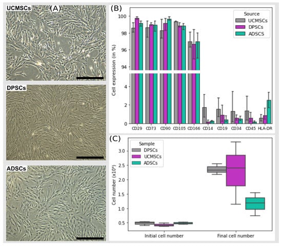Representative image of MSC cultures from different sources and cell characterization. Legend: (A) Cultivation of MSCs from umbilical cord (UCMSCs), dental pulp (DPSCs) and adipose tissue (ADSCs). Magnification: 5×; black bar: 500 µm. (B) Positive and negative expression profiles of membrane markers required by the International Society for Cell and Gene Therapy for three different sources of MSCs. (C) Population doubling (PD) of UCMSCs, DPSCs and ADSCs from P4 to P5. No significant difference in PD was observed between sources (p = 0.193).