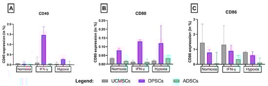 Cultivated under standard conditions, UCMSCs expressed the highest levels of CD152. Expression of this inhibitory molecule by UCMSCs (41.2%) was significantly higher than that by DPSCs (8.19%, p = 0.0338). DPSCs expressed the lowest levels of CD152 in culture with IMDM (8.19%), with IFN-γ (9.52%) and hypoxia (4.57%). When cultivated under IFN-γ stimulation or with a low O2 concentration, all MSC sources expressed similar levels of this molecule. The grouping of data according to the culture method allowed us to observe that the presence of IFN-γ or hypoxia did not induce an increase in CD152 expression by UCMSCs (p = 0.8286), DPSCs (p = 0.8786) or ADSCs (p = 0.6286) (Figure 3A).