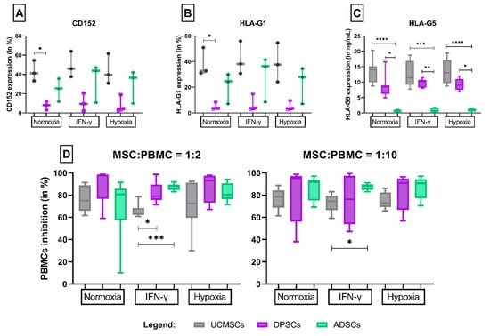 Inhibitory profile of MSCs cultured in standard medium, stimulated with IFN-γ, or under hypoxic conditions. Legend: Differential expression of (A) CD152, (B) HLA-G1 membrane isoform and (C) HLA-G5 soluble isoform between sources of MSCs cultured in different culture conditions; (D) ability to inhibit the proliferation of immune cells by MSCs in different culture conditions with the proportion MSCs:PBMCs 1:2 and 1:10. p values: (*) ≤ 0.05; (**) ≤ 0.01; (***) ≤ 0.001; (****) ≤ 0.0001. UCMSCs = umbilical cord mesenchymal stromal cells; DPSCs = dental pulp stromal cells; ADSCs = adipose tissue-derived stromal cells; INF-y = interferon-gamma; MSCs = mesenchymal stromal cells; PBMCs = peripheral blood mononuclear cells.