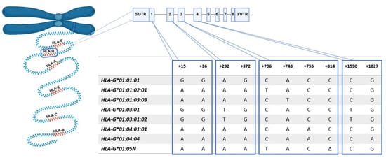 The commercial kit SBTexcellerator® HLA-G (GenDxTM, Utrecht, The Netherlands) was used to amplify the coding region, and the manufacturer’s recommendations were followed. The coverage region for sequencing the HLA-G gene included the coding sequences from exons 1 to 5, which enabled the determination of allelic variants and genotypes. Sequencing was performed by next-generation sequencing (NGS) through the MiniSeq System platform (IlluminaTM, San Diego, CA, USA). To align reads, Twin software from Omixon, Inc. (Budapest, Hungary) was used based on two algorithms for sequence alignment compared with the ImMunoGeneTics (IMGT) database for allele definition.