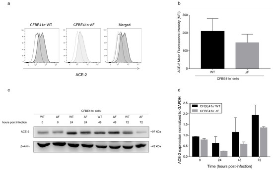 ACE-2 expression levels in CFBE41o- cells determined by different techniques: (a) Flow cytometry of ACE-2 cell membrane expression in uninfected ΔF and WTCFBE41o- cells. The data are representative of n = 3. (b) MFI of ACE-2 in uninfected ΔF and WT CFBE41o- cells. The data are presented as the mean ± SD from independent experiments (n = 3). (c) Total ACE-2 protein quantification by Western blot analysis in CFBE41o- cells. The samples analyzed were harvested from 0 to 72 hpi with SARS-CoV-2. β-Actin was used as a loading control. The data are from a Western blot representative of n = 3. (d) Measurement of ACE-2 mRNA expression normalized to GAPDH (used as a housekeeping control) in RNA extracted from SARS-CoV-2-infected CFBE41o- cells. The data are presented as the mean ± SD from independent experiments (n = 3).