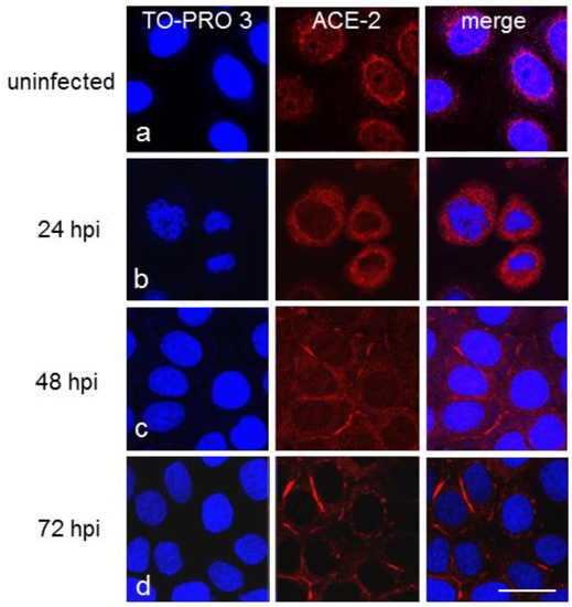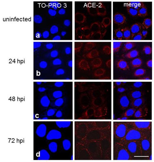Immunofluorescence confocal microscopy showing the expression of ACE-2 (red) in uninfected (a) and infected CFBE41o- ΔF cells obtained at 24 (b), 48 (c), 72 (d) hpi. Cell nuclei were counterstained with TO-PRO 3 (blue). Scale bar: 20 µm.