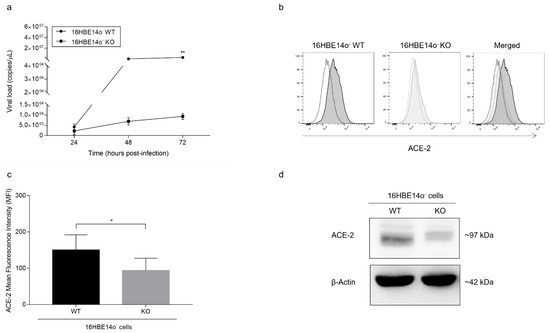 Interestingly, before infection flow cytometry showed higher expression of the ACE-2 membrane protein in WT than in KO 16HBE14o- cells, as indicated by a significant difference (p < 0.05) in MFI (150 ± 41 and 94 ± 34, respectively; Figure 5b,c). This result was confirmed by the drastically lower total ACE-2 protein levels in KO than in WT cells as detected by Western blot analysis, demonstrating that complete deletion of the CFTR gene is related to consistent downregulation of ACE-2 protein (Figure 5d).