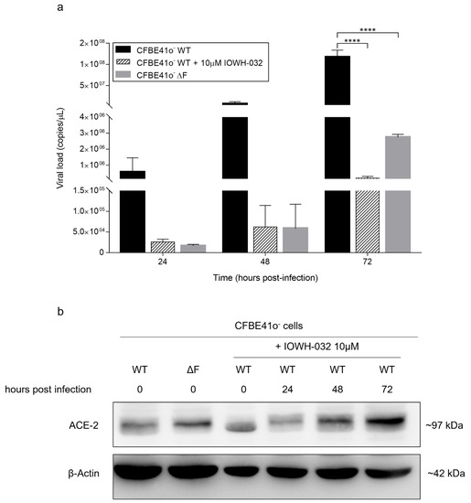 Effect of CFTR inhibition in CFBE41o- WT cells via IOWH-032 treatment compared to WT and ΔF CFBE41o- cells: (a) Time course measurement of viral load in the supernatant of CFBE41o- cells infected with SARS-CoV-2 analyzed by qualitative real-time RT-PCR (Seegene). The data are presented as the mean ± SD from independent experiments (n = 3; **** p < 0.0001). (b) Total ACE-2 protein quantification by Western blot analysis in CFBE41o- cells. Samples were harvested from CFBE41o- WT cells exposed or not to IOWH-032 as well as CFBE41o- ΔF cells at different time points of SARS-CoV-2 infection. β-Actin was used as a loading control. The data are representative of n = 3 experiments.