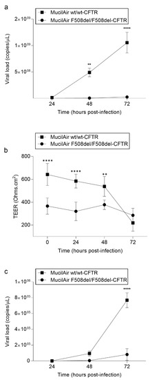 SARS-CoV-2 replication in wt/wt-CFTR and F508del/F508del-CFTR MucilAir™: (a) Apical viral production was assessed in washes of the apical side at 24, 48, 72 hpi of both wt/wt-CFTR and F508del/F508del-CFTR MucilAir™ by commercial qualitative real-time RT-PCR (Seegene). The data are presented as the mean ± SD from independent experiments (n = 3; ** p < 0.01; **** p < 0.0001). (b) Trans-epithelial resistance measurements in wt/wt-CFTR and F508del/F508del-CFTR MucilAir™ (TEER in Ω·cm2) between the apical and basal sides at each time point. The data are presented as the mean ± SD from independent experiments (n = 3). (c) Basolateral SARS-CoV-2 quantification in wt/wt-CFTR and F508del/F508del-CFTR MucilAir™. Basolateral SARS-CoV-2 viral quantification was assessed in the basolateral medium at 24, 48, 72 hpi of both wt/wt-CFTR and F508del/F508del-CFTR MucilAir™ by commercial qualitative real-time RT-PCR (Seegene) able to detect several viral gene targets. The data are presented as the mean ± SD from independent experiments (n = 3; **** p < 0.0001).
