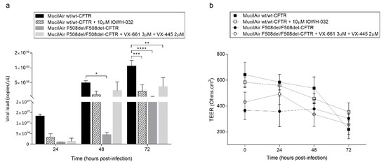 SARS-CoV-2 replication cycle in MucilAir™ is driven by CFTR modulation: (a) Apical viral production was assessed in washes of the apical side at 24, 48, 72 hpi of both wt/wt-CFTR and F508del/F508del-CFTR MucilAir™ with and without CFTR-modulator/inhibitor treatment by commercial qualitative real-time RT-PCR (Seegene). The data are presented as the mean ± SD from independent experiments (n = 3; * p < 0.05; ** p < 0.01; *** p < 0.001; **** p < 0.0001). (b) Trans-epithelial resistance (TEER in Ω·cm2) between the apical and basal sides was measured at each time point in both wt/wt-CFTR and F508del/F508del-CFTR MucilAir™ with and without VX-661+VX-445, for F508del/F508del-CFTR, or IOWH-032, for wt/wt-CFTR, chronic treatments. The data are presented as the mean ± SD from independent experiments (n = 3).