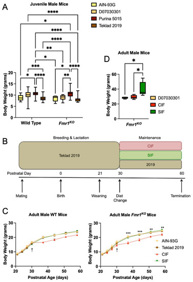 Body weight data generated by Jackson Laboratories for C57BL/6J mice (catalog #000664) at 3 weeks of age indicate that males weigh 10.6 g (SD 1.9) and females weigh 10.1 g (SD 1.7) (https://www.jax.org/jax-mice-and-services/strain-data-sheet-pages/body-weight-chart-000664; last accessed on 13 April 2022), and is based on mice maintained on a grain-based chow containing not less than 6% fat and 18% protein (LabDiet® 5K52/5K67). The major ingredients include ground wheat, ground corn, wheat middlings, ground oats, fish meal, and dehulled soybean meal. The ingredients are most similar to those in Purina 5015. The energy content is most similar to that of AIN-93G. Fmr1KO male mice maintained on AIN-93G and both WT and Fmr1KO male mice maintained on Teklad 2019 exhibited average body weights more than one standard deviation below the average body weight reported for C57BL/6J mice by Jackson Laboratories. Female mice were within one standard deviation of Jackson Laboratory values.