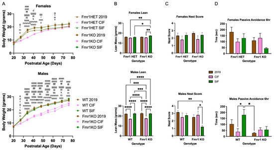 Next, we asked if SIF affected mouse behavior as a function of the Fmr1 genotype (Study 3). First, we repeated the growth charts, albeit using both female (Fmr1HET, Fmr1KO) and male (WT, Fmr1KO) littermate mice in response to Teklad 2019, CIF and SIF diets. Pups were weaned at P20 and randomized to their respective diets (Figure 2A). There were no statistical differences in weight gain based on genotype nor between the Teklad 2019 and SIF diets at all time points tested, similar to Figure 1C. There was a statistically significant decrease in body weight in Fmr1KO females from P27-P48, and at all time points after treatment in WT and Fmr1KO males, maintained on CIF compared to SIF. The mixed effects, two-way ANOVA did not indicate statistical significance in the Fmr1HET female mice fed CIF versus SIF except at P34. The Fmr1HET and Fmr1KO CIF growth curves overlapped, but the growth curve for the Fmr1HET mice fed SIF indicated a trend for lower body weights at all time points compared to Fmr1KO fed SIF. Analysis of body composition by EchoMRI indicated increased average body weight in male WT and male and female Fmr1KO mice fed SIF versus CIF due to increased lean mass and not body fat at P62 and P76 (Figure 2B, Supplementary Figures S3 and S4). Others show higher body weight and lean and fat mass by EchoMRI in 10-week-old Fmr1KO (FVB/129 background) mice fed a Teklad 18% protein diet [29], suggesting strain-specific differences. Fmr1KO males fed SIF exhibited a 56% decrease in nest building scores (Figure 2C). WT male mice fed SIF exhibited a 4.6-fold increase in learning (Figure 2D). Increased learning in WT male mice in response to SIF in the passive avoidance test concurs with elevated Children’s Memory Scale (CMS) Index scores in typically developing males in the Beginnings Study soy infant formula cohort [30].