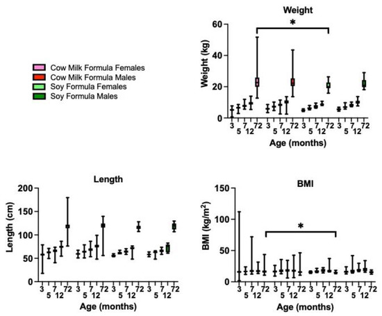 Subjects were binned by sex, exclusive breast milk use for 3 months, and use of cow milk or soy-based infant formula for 3 months. BMI was calculated as (weight)/(height2) in metric units. Weight, height, and BMI data at 3, 5, 7, 12, and 72 months of age were analyzed by mixed-effects ANOVA with matching by age, and grouped data plotted as min-to-max box plots using Prism version 9.2.0 (GraphPad Software, LLC, San Diego, CA, USA). Categorial data were analyzed by Chi square, or Fisher exact test if there were less than 5 subjects in any row or column variable. Statistical significance was denoted by p < 0.05.