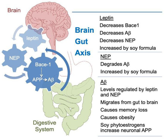 Model of proposed gut-brain interactions underlying soy effects in Fmr1KO mice. SIF could contribute to increased weight gain through a pathway involving APP metabolism, leptin, and NEP. It has been hypothesized that amyloidogenic processing of APP in peripheral tissues plays a key role in the response to nutrient excess and that this could contribute to the pathogenesis of metabolic diseases [69]. Aβ, which is generated by β-secretase 1 (Bace1) and γ-secretase processing of APP, can affect numerous metabolic processes [70,71]. APP and Aβ levels are dysregulated in mouse and human models of FXS [72,73], a disorder comorbid with increased BMI [74] and where more severe phenotypes are associated with consumption of single-source soy-based diets [17,20,21]. It is known that soy phytoestrogens increase APP synthesis in primary cultured mouse neuronal cells [17], which would provide more template for Bace-1 processing, but the mechanism(s) mediating the effects of dietary soy are not known [75]. Leptin and NEP were identified as plasma-based biomarkers responsive to SIF. These biomarkers are linked with APP processing [76], obesity [67,77,78], and each other [65]. Aβ can migrate from the gastrointestinal (GI) tract to the brain and cause cognitive impairment, but soy flavonoids have a protective effect [79]. Leptin attenuates the detrimental effects of Aβ on spatial memory in rats [80]; herein, SIF increased leptin levels and improved 6-hr recall in the passive avoidance test in WT mice. Soy-based diets negatively impact seizure and autism outcomes in mouse and human models [17,18,19,20,21] consistent with the increased need for classroom support and help needed in school. In total, these data support a model of overlapping feedback loops with U-shaped response curves, involving APP processing, leptin, and neprilysin that underlies diet-induced metabolic and neurological outcomes in response to consumption of single-source soy-based diets.