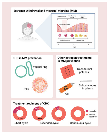 Combined oral contraceptives (COCs) are the most popular type of CHC, with a wide range of hormones, doses, and regimes. The estrogenic component is mainly represented by EE, usually in a dosage of 20–30 μg, but the newest formulations today also deliver natural forms of estrogen, such as E2, estradiol valerate (E2V), the ester of E2, and estetrol (E4), a fetal form of estrogen [114]. The progestogenic component ensures the efficacy of the contraceptive and includes several types of progestogens at different doses depending on their biological potency [115]. The most common way of administrating COCs is the 21/7 regimen (i.e., 7 days of HFI) [116]. However, the availability of regimens with a shorter (6, 4, or 2 days) or absent HFI enables the prevention of the migraine worsening that sometimes characterizes the HFI. Indeed, observational studies showed that the reduction [117,118] or the absence [119] of HFI led to a significant decrease in the frequency, intensity, and duration of migraine attacks. Another strategy to improve MM during COCs use envisages estrogenic supplementation during the HFI to prevent estrogen withdrawal [120]. Both therapeutic approaches suggest that inhibiting the fall in estrogen or its replacement may be effective in the prevention of MRM and PMM (Table 1).
