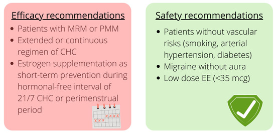 The European Headache Federation and the European Society of Contraception and Reproductive Health have recommended avoiding CHC in patients suffering from migraine with aura unless it is mandatory for comorbidities such as polycystic ovary syndrome; in these cases, gynecologists must individually choose the type of contraceptive [105]. Patients with migraine without aura should avoid CHC when other vascular risk factors coexist; otherwise, progestin-only contraceptives or COCs with doses of estrogens lower than 35 μg are preferable [105].