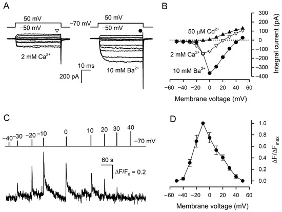 Taste cells were isolated from mouse circumvallate (CV) papillae and examined with the perforated patch-clamp technique and Ca2+ imaging. Taste cells of a particular subtype could be reliably identified by a characteristic set of VG currents that they exhibited under pseudophysiological conditions [8,23]. In particular, solely type III taste cells functionally express VG Ca2+ channels [7,8,12]. With 140 mM CsCl in the patch pipette that suppressed VG K+ currents, type III taste cells became even more authentic electrophysiologically [24], while the inhibition of VG Na+ channels with 100 nM TTX allowed for rectifying the activity of VG Ca2+ channels more clearly. Under these conditions, nearly 90 type III cells were assayed overall. Usually, these cells exhibited subtle VG Ca2+ currents of 30–100 pA at 2 mM bath Ca2+ (Figure 1A, left panel), which completely disappeared in the presence of 50 μM Cd2+ in the bath (Figure 1B). The substitution of 2 mM Ca2+ for 10 mM Ba2+ markedly enhanced currents through VG Ca2+ channels (Figure 1A, right panel). In designated experiments, taste cells were loaded with Fluo-8, patch clamped, and assayed with Ca2+ imaging to examine Ca2+ signals initiated by VG Ca2+ entry. Overall, we found 12 quite robust type III cells with active Ca2+ channels, which allowed for the stable concurrent monitoring of VG Ca2+ currents and intracellular Ca2+ for a sufficiently long period. Being depolarized by 100 ms voltage pulses of variable magnitude, these cells showed voltage-dependent Ca2+ transients (Figure 1C). Consistently with the I–V curve characterizing VG Ca2+ currents at 2 mM bath Ca2+ (Figure 1B), these depolarization-induced Ca2+ signals were maximal at −10 mV (Figure 1D).