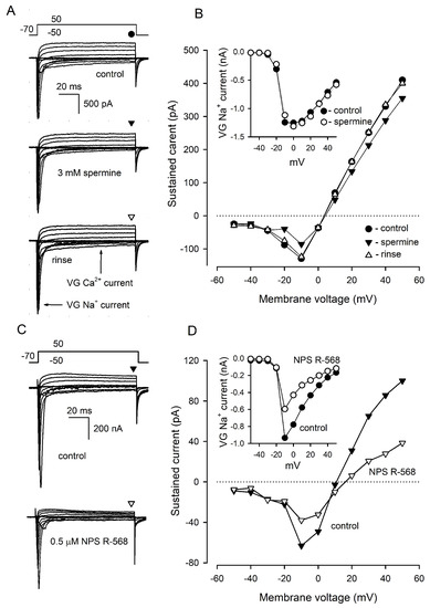 Effects of CASR agonists on VG currents in type III cells. (A) Representative (n = 9) recording of integral VG currents in a type III cell in control (upper panel) in the presence of 3 mM spermine (middle panel) and after rinse of the CASR agonist (bottom panel). The cell was held at −70 mV and polarized from −50 to 50 mV by 100 ms voltage pulses with 10 mV increment. Leak currents were subtracted using the P/4 protocol. The patch pipette contained 140 mM CsCl and amphotericin B (400 μg/mL), the bath solution contained 140 mM NaCl and 2 mM CaCl2. The sustained VG currents were evaluated in the moments indicated by the symbols above the current traces. (B). I–V curves of the sustained VG currents shown in (A). The inset, I–V curve for VG Na+ current recorded in control (●) and in the presence of 3 mM spermine (ο). (C) Representative effect of 0.5 μM NPS R-568 on VG currents in type III cells (n = 8). The recording conditions as in (A). (D) I–V curves of the sustained VG currents shown in (C). The inset, I–V curve for VG Na+ current recorded in control (●) and in the presence of 0.5 μM NPS R-568 (ο).