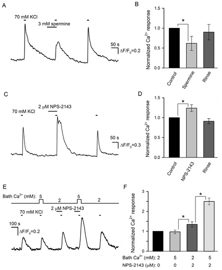 We next examined the effects of spermine and NPS-2143 on Ca2+ responses initiated by the depolarization of individual taste cells by 70 mM KCl. Unfortunately, the responsivity of isolated type III cells to the depolarization was liable to rundown that was strengthened by the CASR ligands to some extent. For this reason, the effects of spermine and NPS-2143 on the same cell were poorly conclusive, and cell sensitivity to each compound was assayed separately. Overall, we treated 12 sufficiently robust type III cells with 3 mM spermine and found this CASR agonist to reversibly diminish depolarization-induced Ca2+ bursts by 38 ± 17% compared to control (Figure 6A,B). In contrast, KCl-induced Ca2+ transients were increased by 24 ± 8% in the presence of 2 μM NPS-2143 (9 cells) (Figure 6C,D).