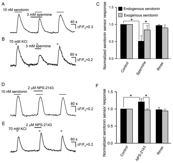 Prior to the assay of the expected modulation of serotonin secretion by spermine and NPS-2143, we performed control experiments to make clear whether these CASR ligands could influence the serotonin responsivity of the 5-HT4/PF sensor. It turned out that compared to the control, 3 mM spermine decreased cAMP signals in 5-HT4/PF cells elicited by 10 nM serotonin by 16 ± 13% on average (n = 56) (Figure 7A). NSP-2143 (2 μM) reduced biosensor responses solely by 4 ± 3% (n = 48), but this small effect was poorly reversible (Figure 7D). Thus, the 5-HT4/PF biosensor turned out to be somewhat sensitive to the CASR ligands.