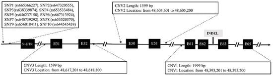 For SNP detection, using the Ensembl online database (http://asia.ensembl.org/, accessed on 1 December 2020), a pair of primers were designed to amplify fragment containing 10 SNP mutations within the promoter region of DNAH1 gene in 327 goats. These variations including SNP1 (rs665366227), SNP2(rs647320555), SNP3(rs638339874), SNP4 (rs653533484), SNP5 (rs646237158), SNP6 (rs667313924), SNP7 (rs640739292), SNP8 (rs653520370), SNP9 (rs656018411) and SNP10 (rs644545438). For InDel detection, a total of 9 putative InDel mutations of DNAH1 were studied (P1–P9). In accordance with a previous prediction, the corresponding primer sequences were designed according to the 9 mutation positions using Primer software 5.0 (Canada, Premier). For CNV detection, validation of goat exonic CNV1 (g:48593201–48595200), CNV2 (g:48603601–48605200) and CNV3 (g:48617201–48618800) within the DNAH1 gene in chromosome 22 was performed referring to the Animal Omics Database (http://animal.nwsuaf.edu.cn/, accessed on 10 July 2021). Three pairs of primers were designed to amplify these three CNV regions of DNAH1 in 318 goats (Figure 1). Given that previous studies suggest that there are neither CNVs nor segmental duplication in the goat melanocortin 1 receptor (MC1R) gene, we selected MC1R as the internal reference gene and designed a pair of primers to amplify this target sequence []. The specific primer sequences are shown in Table S1.