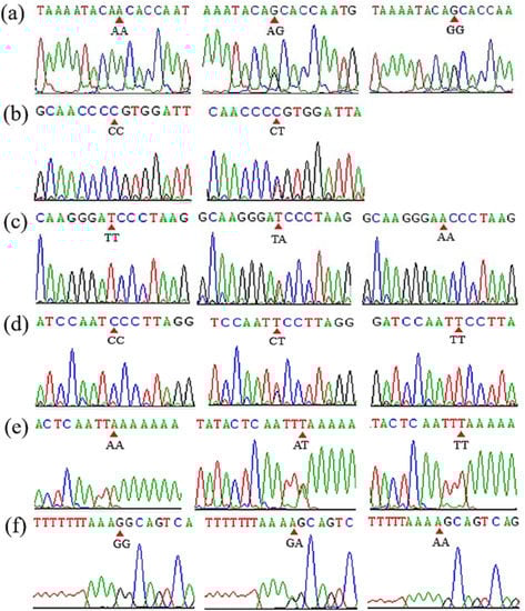 The result of sanger sequencing of SNP1 (a), SNP4 (b), SNP5 (c), SNP7 (d), SNP9 (e) and SNP10 (f) mutations in goat DNAH1 gene.