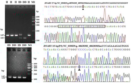 Electrophoresis and sequence diagrams of P1 and P3 InDel loci of DNAH1 gene in Shaanbei white cashmere goat. The P1 locus is the result of II and DD genotype sequencing. P3 is the DD and ID genotype sequencing result.