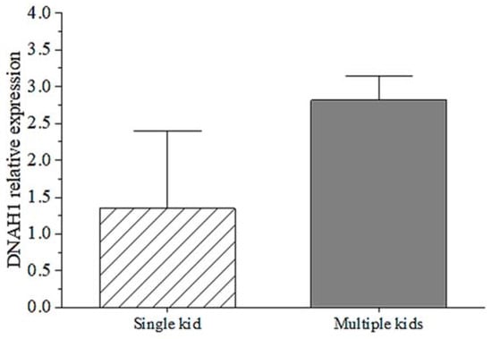 The qPCR results proved the mRNA expression of the DNAH1 gene was different in mothers of single kids and mothers of multiple kids. The mRNA expression showed that the DNAH1 gene had higher expression in mothers of multiple kids than mothers of single kids. Although there is no significant difference between them (p > 0.05), the relationship between mRNA expression of goat DNAH1 gene and litter size traits deserve to be further explored. This result indicates that DNAH1 expression might play an important role in litter size traits.