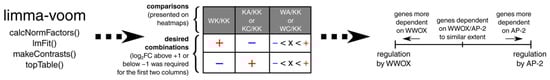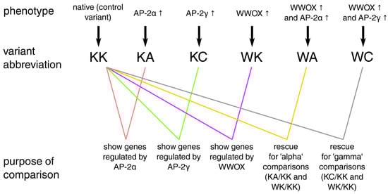 Genes from differential expression analysis were temporarily limited to AP-2α or AP-2γ targets, depending on comparison. KA, WK and WA were compared to KK (henceforth called ‘alpha’ comparisons) via AP-2α target list while KC, WK and WC were compared to KK (henceforth called ‘gamma’ comparisons) through AP-2γ equivalent. These filtered lists were then input into R environment and rows having opposite marks in two values (of two different columns/phenotypes) were retained using sign() function, which was followed by verification of whether a value in another (third) column is between two previous ones. Requirement of log2FC above 1 or below −1 had to be met for the values in the first and second columns. Through that, it was possible to keep AP-2 targets whose expression is inversely regulated by WWOX and AP-2α/γ, which is alleviated when these two are overexpressed within a single cellular variant. A schematic presentation of this step is summarized in Figure 2. Heatmaps were generated using the Shiny web server Heatmapper (http://www.heatmapper.ca/; accessed on 9 November 2021). The row scale type was set along with the average linkage clustering method and Pearson distance measurement. Clustering to rows was applied to visualize the dendrogram.