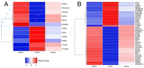 The targets of AP-2 transcription factors were first filtered to retain the genes whose expression was regulated in opposite directions by WWOX (WK) and AP-2α (KA) or AP-2γ (KC) when compared to control (KK). Subsequently, it was verified whether the difference in expression is alleviated in the rescue variant (i.e., WA or WC, depending on comparison). Thus, the expression of each AP-2 target in the WA variant was between that of WK and KA, as was the case of WC in reference to WK and KC. As visible in Figure 3, the above requirements were met by less genes in ‘alpha’ comparisons (Figure 3A) than in ‘gamma’ counterparts (Figure 3B). ‘Alpha’ or ‘gamma’ stems from AP-2α or AP-2γ, respectively, and refers to all variants that are compared in order to disclose the role of a specific AP-2 factor as well as WWOX (‘alpha’ comparisons are visible in Figure 3A while ‘gamma’ comparisons in Figure 3B). In both cases, it is possible to identify genes which are more dependent on WWOX (e.g., INHBB for ‘alpha’ and EFNB2 for ‘gamma’ comparisons) or AP-2 factor (SEMA6A for AP-2α and L1CAM for AP-2γ). Nevertheless, there are also examples where a gene is similarly dependent on WWOX and AP-2, e.g., CLDN9 in ‘alpha’ and KHDRBS3 in ‘gamma’ comparisons. Some targets were identified in two sets, i.e., CDH5, FBLN2, L1CAM and PRKCA, and their changes in expression indicate that they are similarly regulated by both AP-2α and AP-2γ.