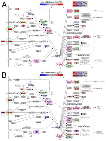 Afterwards, the above pathways were visualized separately for ‘alpha’ and ‘gamma’ comparisons. In this step, the temporary restriction of investigating only AP-2 targets was lifted; thus, all genes from differential expression analysis were included. An example pathway which repeated in ‘alpha’ (Figure 4A) and ‘gamma’ (Figure 4B) comparisons was Rap1 signaling. Some changes and similarities in gene expression were observed. Namely, while the expression of G Protein-Coupled Receptors (GPCRs), calmodulins (CaMs) and thrombospondin 1 (TSP1) was increased during WWOX or AP-2α overexpression, the opposite was found when AP-2γ was overexpressed. In contrast, the regulation of Spa-L2 was similar during AP-2α and AP-2γ overexpression compared to WWOX. Likewise, the Rac proteins had the same pattern of expression changes in ‘alpha’ and ‘gamma’ comparisons. Lastly, although the changes in Receptor Tyrosine Kinases (RTKs) were in the same direction for AP-2γ and AP-2α, the latter decreased their expression to a greater extent. However, regardless of AP-2 factor, the regulation of aforementioned examples in rescue variants seems to be WWOX-dependent (WA/KK and WC/KK patterns are similar to WK/KK). The remaining pathways for ‘alpha’ and ‘gamma’ comparisons are visualized in Figures S1 and S2, respectively.