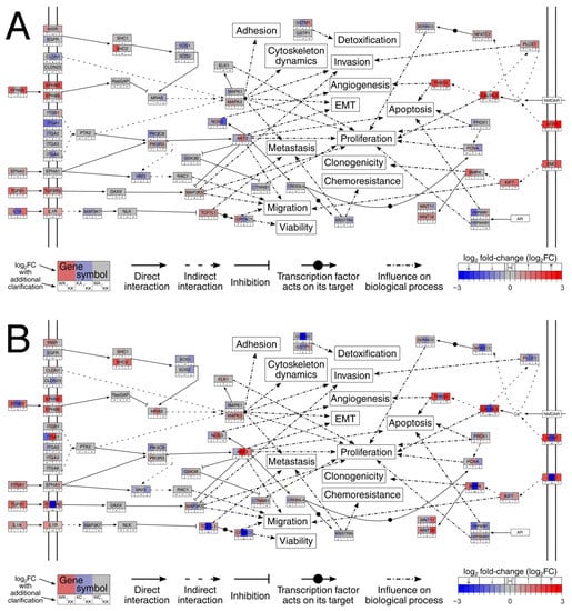 Due to the extensiveness of information obtained from KEGG graphs, it was intended to integrate all relevant data to the form of a single graph in order to collate the molecular differences and similarities between phenotypes, linking them to biological processes (Figure 5). About half of the processes were previously investigated in our in vitro research, the remainder was included to capture the essence of the carcinogenesis process from the literature data on genes that were included in the graph. For instance, the signal transduction beginning with TGFB1 and TGFBR2 could affect invasion, proliferation or migration processes through MAP3K5. In ‘alpha’ comparisons (Figure 5A) the changes caused by either WWOX or AP-2α overexpression are consistent with each other, i.e., WWOX increased TGFB1, TGFBR2 and MAP3K5 expression while AP-2 increased the first two but did not affect the latter. On the contrary, changes visible in ‘gamma’ comparisons (Figure 5B) indicate that AP-2γ decreased TGFB1, MAP3K5 and TGFBR2 (herein listed in the order of potentiated downregulation). Likewise, the signaling by SMO, KIF7 and BMP4 is decreased by AP-2γ but increased by WWOX and AP-2α, which could affect migration or clonogenicity.