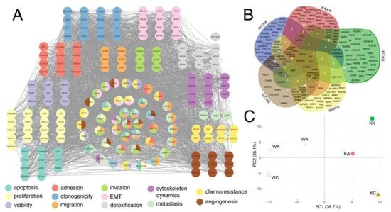Visualization of definitive network and the PCA of cellular variants using gene expression data. (A) Definitive network with emphasis on processes. (B) Intersection analysis of definitive network. (C) PCA using expression data of genes from definitive network.