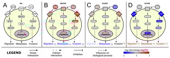 The most relevant similarities and differences in signaling by WWOX, AP-2α and AP-2γ. (A) KK variant. (B) WK/KK comparison. (C) KA/KK comparison. (D) KC/KK comparison.