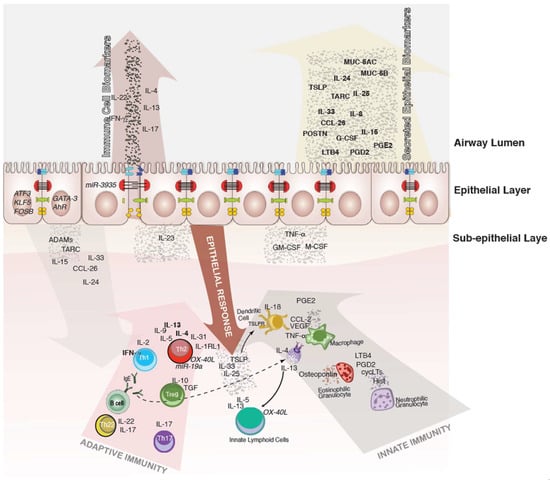 Airway epithelial cells act in an orchestrated manner with resident and recruited immune cells to regulate airway immunity (Figure 1). Whilst transcriptomic studies of the local matrices of the airways, such as the extracellular matrix, but also induced sputum [,,] or bronchoalveolar lavage (BAL) [,], facilitate the detailed characterization of immune cell populations within the airway lumen, bronchial brushing samples and biopsies of the upper and lower airways from allergic patients and healthy subjects—even if ethically justifiable only with indication—capture both the epithelial and immune cell components. The concept of united airways encompasses an anatomical and immunological relationship between the upper and lower airways, which form a single organ. The concept combines diseases of the upper and lower respiratory tract, which according to this concept, often have comorbidities, since they reflect manifestations of a single underlying disease at different points in the respiratory tract. Allergic asthma as a comorbidity of allergic rhinitis represents the archetypal “united airways” disease, but could also be a heterogeneous condition consisting of several phenotypes and underlying pathobiological mechanisms [].