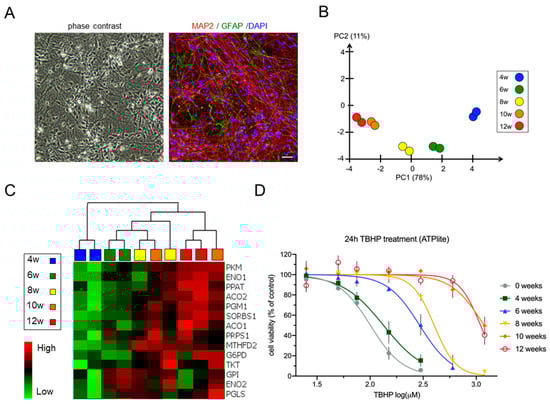 Neural differentiation of lt-NES cells is characterized by changes in metabolic pathway gene expression and increasing resistance to stress. (A) Phase contrast picture and a representative immunofluorescence staining of 8-week-differentiated lt-NES cells stained for MAP2 and GFAP. Scale bar, 100 µm. (B) Principal component analysis of differential gene expression in lt-NES cultures differentiated for 4, 6, 8, 10 and 12 weeks based on 1919 variables, showing clustering of the samples according to differentiation time. (C) Heatmap of glucose metabolism-associated gene expression showing upregulation of neuron-specific glycolysis genes (e.g., PKM, G6PD, ENO1) and pentose phosphate pathway (PPP)-associated genes (e.g., TKT, PGLS) with time of differentiation. Data were generated using an Affymetrix transcriptome microarray (n = 2). (D) Resistance to TBHP treatment increases with differentiation. Proliferating and differentiated lt-NES cells were treated with TBHP for 24 h. Toxicity was assessed by ATPlite assay at the end of the treatment phase with the indicated concentrations. Shown are measurements of the response to TBHP (after 24 h) of undifferentiated, 4, 6, 8, 10 and 12 weeks differentiated lt-NES cells, presented as percentages relative to untreated cells (equal to 100%). Data are presented as means ± SEM (n ≥ 3 per differentiation time point, consisting of at least 4 technical replicates each).