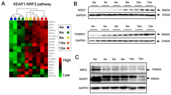 Dynamic regulation of the KEAP1-NRF2 pathway during neural differentiation. (A) Heatmaps showing the differential gene expression pattern of known NRF2-pathway specific genes across differentiation of lt-NES cultures. Data were generated using an Affymetrix transcriptome microarray. Expression levels (log2 scale) for each gene were averaged across samples and differences are depicted as standard deviation changes. Clustering analysis was performed by multigroup comparison (n = 2). (B,C) Protein expression of NRF2 pathway components was assessed by immunoblot analysis at indicated weeks (w) of lt-NES cell differentiation. (B) Protein levels of the NRF2 downstream targets NQO1 and TXNRD1 increase during neural differentiation. (C) NRF2/KEAP1 protein levels decrease during neural differentiation.